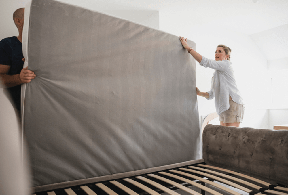 Use at least two people to lift the mattress safely. This prevents damage to the mattress and frame.